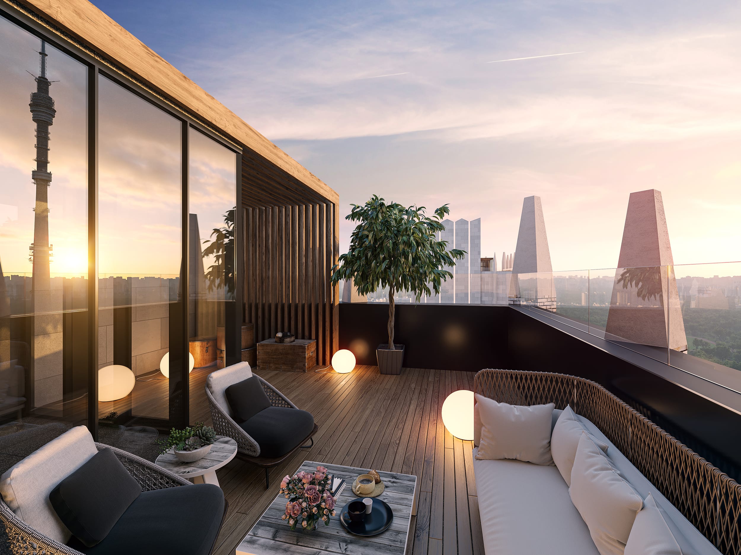 В проекте предусмотрено более 115 продуманных планировочных решений, чтобы каждый житель мог реализовать свои мечты и жить с комфортом, не переплачивая за лишние метры. В доме 1 214 квартир разных форматов: уютные студии площадью от 23 кв. м., квартиры с террасами, с камином, с окном в ванной или гардеробной комнате, пентхаусы с высотой потолков до 6,5 метров и террасами с панорамными видами на парки или центр города.