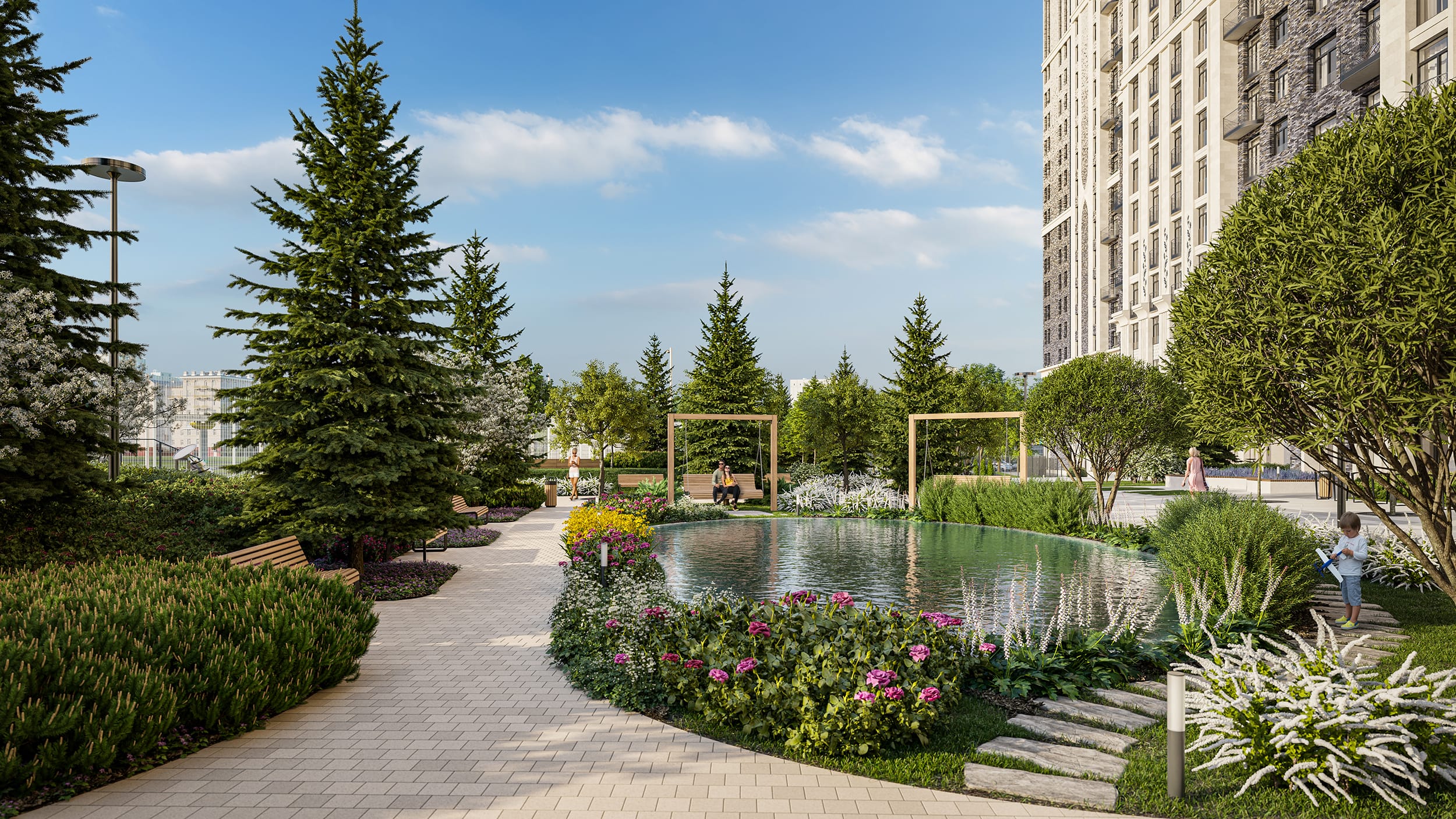 Собственный ландшафтный двор площадью более 1,7 га спроектирован как живописная долина с цветущими кустарниками, взрослыми деревьями, благоухающими луговыми травами, дорожками и мягкой вечерней подсветкой. Скрытая от шума улиц, машин и посторонних людей, территория зеленого оазиса разделена на зоны для спокойного и активного отдыха.